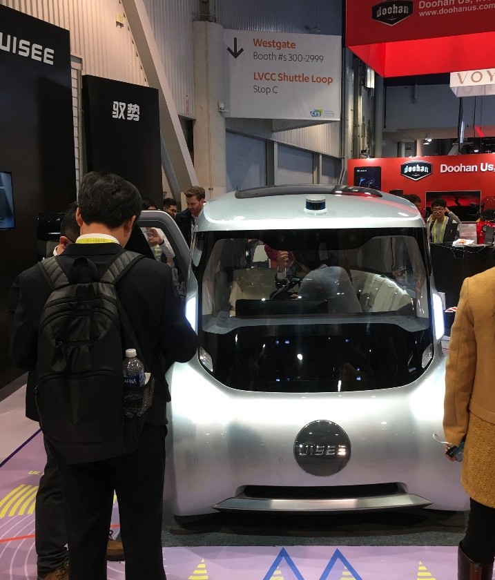 馭勢科技UISEE——這家北京的新創公司進步神速。一年前,我見過該公司的CEO吳甘沙先生,吳先生是原來英特爾公司的中國CTO。當時該公司剛剛起步,定位還是為汽車廠家提供ADAS系統。時隔一年,這次展會馭勢居然展出了一款自動駕駛的概念車。這款車的造型很獨特,只有一側有兩扇門,裝備激光雷達、毫米波雷達和超聲波,360度環視攝像頭,適合在城市里單身上班族的交通。