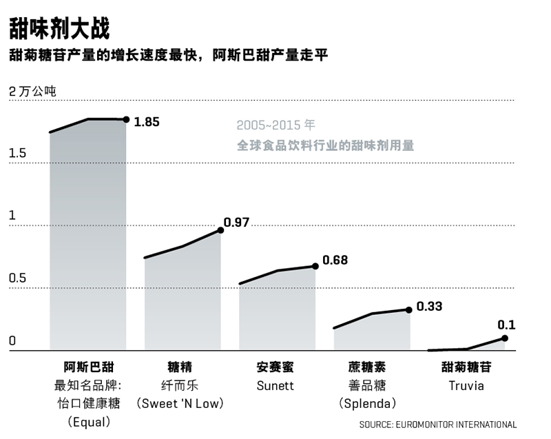為了消除糖的副作用,數十年來,人們一直在孜孜不倦地尋找低熱量的甜味劑。而目前普遍使用的替代品正在越來越多地受到人們的摒棄。英敏特公司稱,39%的消費者認為,最好不要食用含有阿斯巴甜和糖精等有可能帶來健康風險的人工甜味劑。從2011年到2016年,上述甜味劑的銷量下跌了13%。