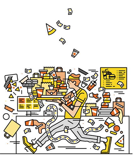 例如,擁有大量數字訂單的餐廳可能需要較少的桌椅數量和更大的取餐空間。對于智能手機訂餐,速度常常是關鍵,所以某些停車位可能會空出來,專門留給迅速過來的取餐客。同樣,餐館內部也要有單獨的取餐點。對餐廳的改造可能延伸至廚房。比如,在墨西哥餐廳Chipotle Mexican Grill,就有兩條獨立的備餐流水線整日忙碌不停:一條服務于餐廳內的顧客,另外一條應對網絡訂餐者。