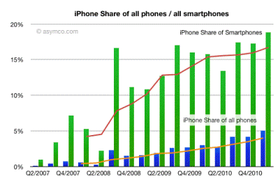 ????Business Insider's Henry Blodget may come to regret -- if he doesn't already -- using the phrase "dead in the water" to describe the performance of Apple's (AAPL) iPhone in a comScore market share survey that seemed to show, as Blodget's headline put it, that "Android is destroying everyone." ????The comScore survey to which Blodget was referring showed Google's (GOOG) Android share of the U.S. smartphone market growing 7 percentage points (to 33%) in the three months ending February while Apple's grew only 0.2 (to 25.2%). ????But the iPhone certainly doesn't look like it's drifting in the chart Asymco's Horace Dediu published Wednesday. ????In fact, iPhone sales grew 113% year over year last quarter, gaining steam even after the big holiday quarter. Apple is now the fourth most popular cell phone vendor in the world, bigger than Research in Motion (RIMM), HTC, Motorola (MOT), Sony Ericsson (SNE, ERIC) and ZTE. ????"So what makes the iPhone dead in the water?" Dediu asks rhetorically. ????"The claim," he writes, "was made relative to the (a) share of (b) mobile platforms (c) installed base (d) in the US. In other words, if one adds all Android phones in use vs. the iPhones in use in the US (while ignoring iOS devices other than iPhone) while the market is growing at nearly triple digit rates, then the iPhone is not gaining (much) share. ????"That's the most obtuse way of suggesting a slowing product." ????You can read the rest of Dediu's Blodget takedown -- and subscribe to Asymco's RSS feed -- here. |