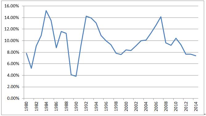 先看歷史數(shù)據(jù),美元加息不是新鮮事,隨著經(jīng)濟(jì)的發(fā)展,美元經(jīng)歷了很多加息周期,較老的數(shù)據(jù)對現(xiàn)在借鑒意義不大,我們就從20世紀(jì)80年代開始,用這30多年的數(shù)據(jù)進(jìn)行分析。通常認(rèn)為自1983年以來,美元大致有6次加息周期: