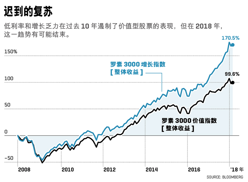 然而到了今天,美國經濟體里的其他部分開始追趕龍頭企業。據FactSet的數據,從2012年到2016年,標準普爾500指數(S&P 500)里的公司的平均季度盈利增長率為2.5%。2017年,情況有所變化,第四季度的增長率達到最高點,達14.8%。當企業整體盈利增長時,價值型股票通常會有更好的表現。
