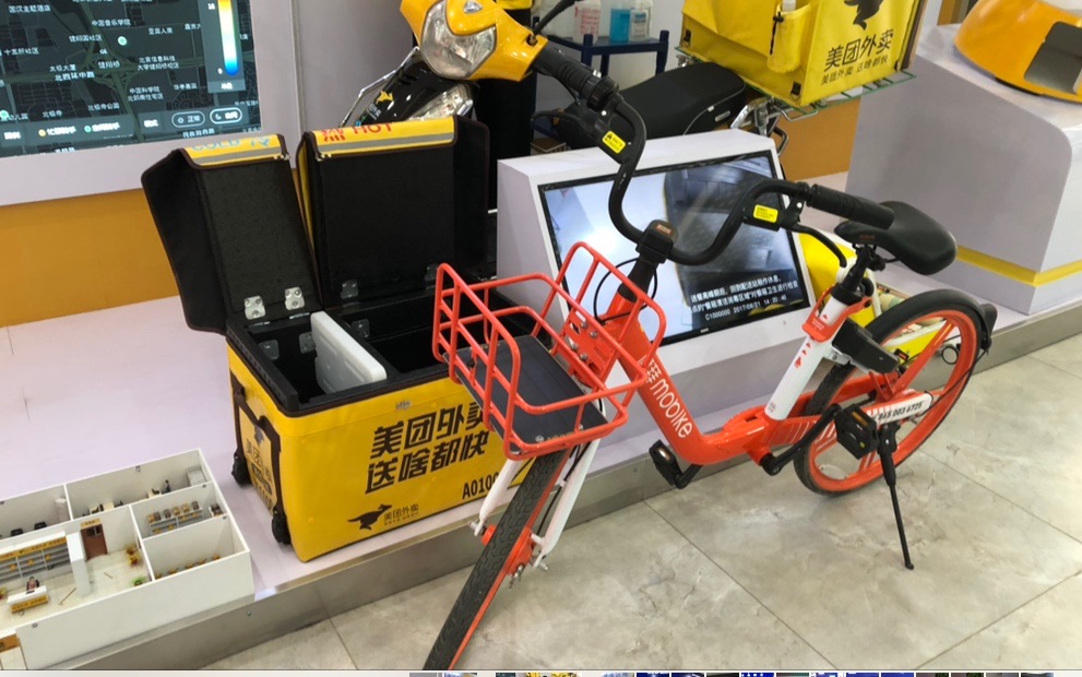 返回到美團(tuán)后,我進(jìn)入了他們的大廳,大廳有點(diǎn)像博物館。他們在大廳里擺放著各種帶有簽名的黃色制服以及配送袋。由于美團(tuán)剛剛收購了摩拜單車,所以大廳里也放了一輛這種單車。