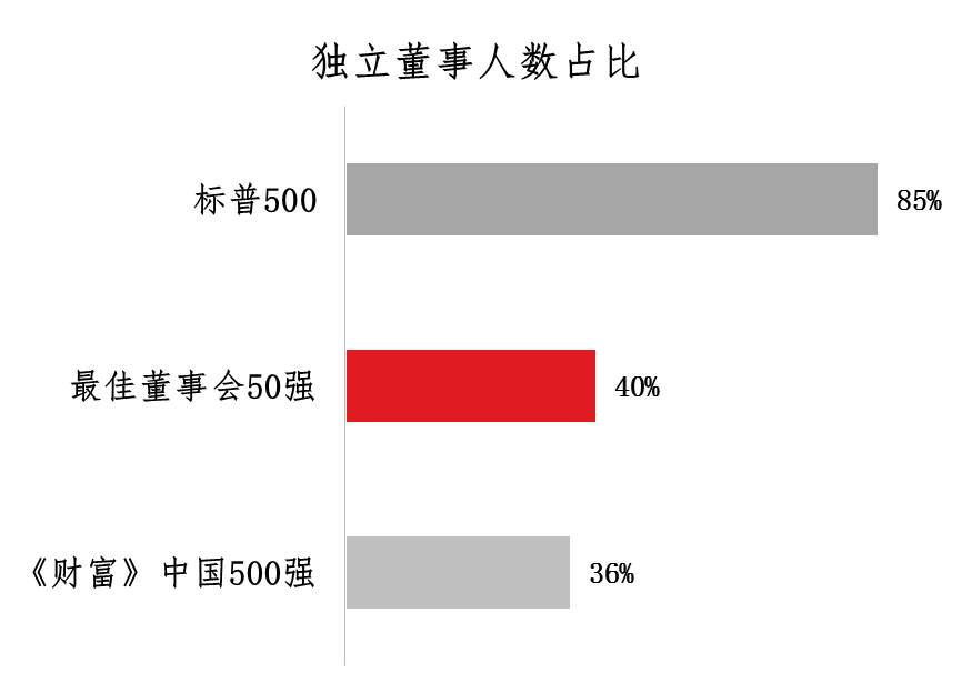 在2018年《財富》中國500強上榜公司中,獨立董事占董事會人數比例的中位數為36%,略高于中國證監會和香港聯交所規定的獨立董事占比不少于1/3。最佳董事會50強的獨董占比中位數為40%,高于全榜單,其中中國建筑股份有限公司的獨立董事占比最高,達到了67%。